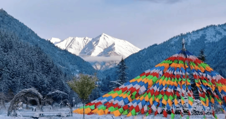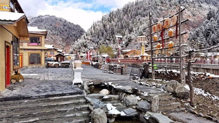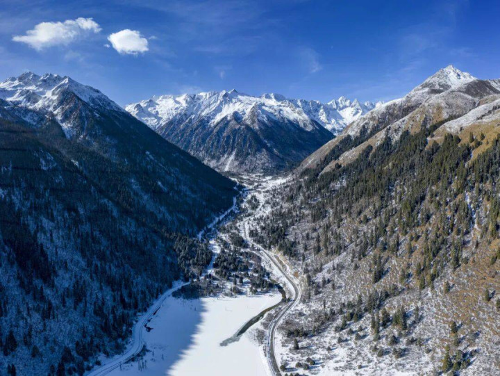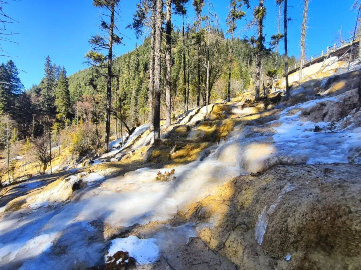 沿着卡龙沟的木栈道漫步,溪水在冰层下叮咚作响,空气清冽得像山泉水,每一次呼吸都让人神清气爽。